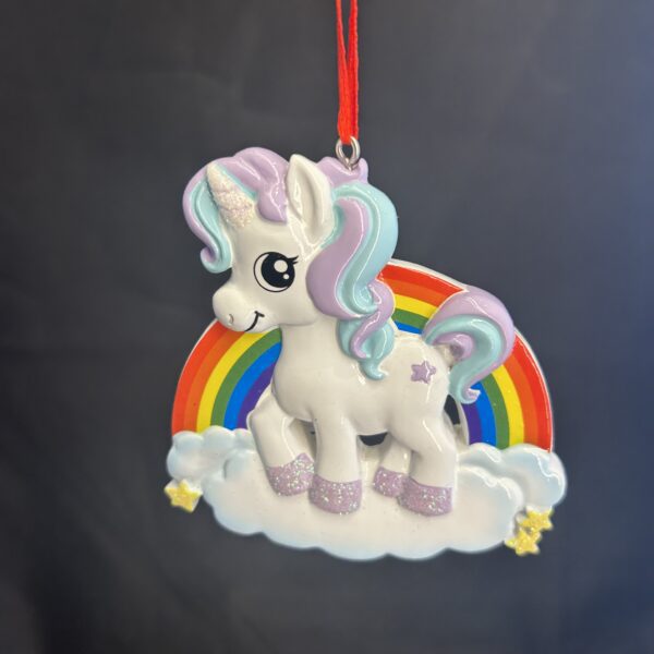 A fantasy pastel unicorn flying over a rainbow. This hanging Christmas tree plaque can be personalised with the name and message of your choice and makes an ideal Christmas gift.