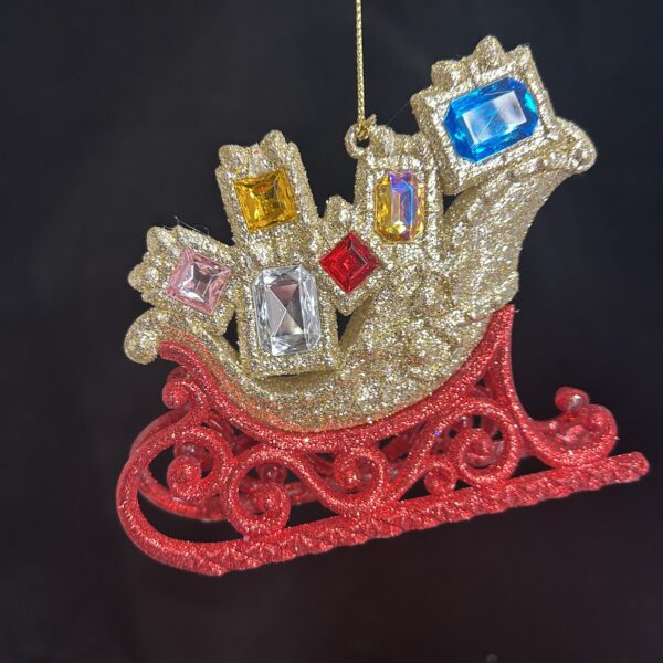 Every Christmas tree needs a glittered sleigh as a key decoration. This red sleigh hanging decoration measures 12cm and  is loaded with presents and everything is heavily glittered in gold to stand out on this years tree.